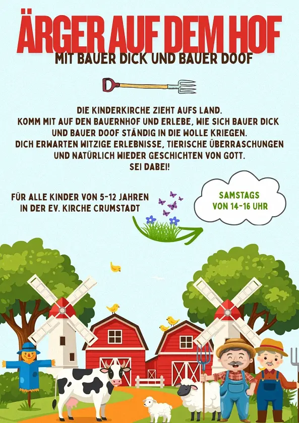In der Regel findet wöchentlich (außer in den Ferien) um 16.30 Uhr im Ev. Gemeindezentrum “Pfarrscheune” in Wolfskehlen eine Mini-Jungschar mit wechselnden Themen für Kinder von 5 bis 7 Jahre statt.